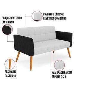 Você gosta de colecionar vários momentos memoráveis com sua família e amigos? Que tal recebê-los, com móveis de altíssima qualidade que só a D'Rossi tem? O Sofá Namoradeira Elisa é adequado para você! Seu design retrô é a grande tendência do momento. Pode ser utilizado em diversos espaços da casa, em salas, hall de entrada, quartos, cozinhas, varanda, sacada, escritório, dentre outros. Contém as seguintes características: A estrutura é feita de madeira de Eucalipto 100% de reflorestamento, e a Base de Madeira Preto, além de ser resistente e durável, suporta em média até 120 kg. Assento, encosto e braços, contém enchimento de espuma D-23 e é estofada em tecido Corano Preto com Linho, no tom Cinza, que oferece muito conforto e resistência ao sentar, com aquela sensação de maciez e aconchego. Possui também, detalhes de costura no encosto e assento, resultando em um acabamento impecável, conferindo muito mais valor e elegância ao seu espaço. Para complementar a decoração com esse lindo Sofá Namoradeira, a dica é utilizar mantas, almofadas ou vasinho de flor. E pronto, seu cantinho estará perfeito para descansar e relaxar! Aqui, você encontra várias opções, para que seus amigos e familiares se sintam acolhidos. Garanta já seu Sofá Namoradeira.