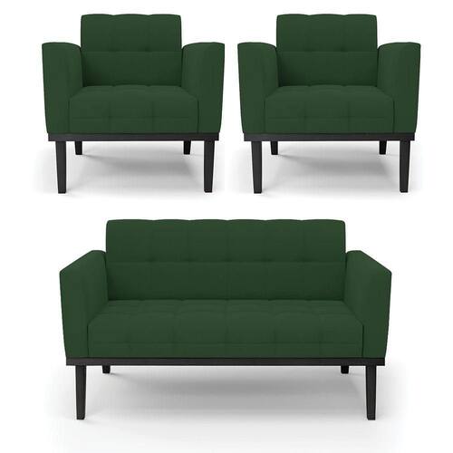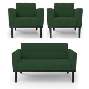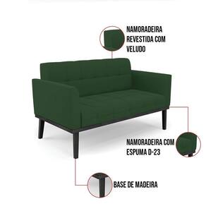 Você gosta de colecionar vários momentos memoráveis com sua família e amigos? Que tal recebê-los, com móveis de altíssima qualidade que só a D'Rossi tem? O Sofá Sofá Namoradeira e Poltrona Elisa é adequado para você! Seu design retrô é a grande tendência do momento. Pode ser utilizado em diversos espaços da casa, em salas, hall de entrada, quartos, cozinhas, varanda, sacada, escritório, dentre outros. Contém as seguintes características: A estrutura é feita de madeira de Eucalipto 100% de reflorestamento, e a Base de Madeira Fixa Preto, além de ser resistente e durável, suporta em média até 120 kg. Assento, encosto e braços, contém enchimento de espuma D-23 e é estofada em tecido Veludo, na cor Verde, que oferece muito conforto e resistência ao sentar, com aquela sensação de maciez e aconchego. Possui também, detalhes de costura no encosto e assento, resultando em um acabamento impecável, conferindo muito mais valor e elegância ao seu espaço. Para complementar a decoração com esse lindo Kit Sofá Namoradeira e Poltrona Elisa, a dica é utilizar mantas, almofadas ou vasinho de flor. E pronto, seu cantinho estará perfeito para descansar e relaxar! Aqui, você encontra várias opções, para que seus amigos e familiares se sintam acolhidos. Garanta já seu Kit Sofá Namoradeira e 2 Poltronas Elisa.