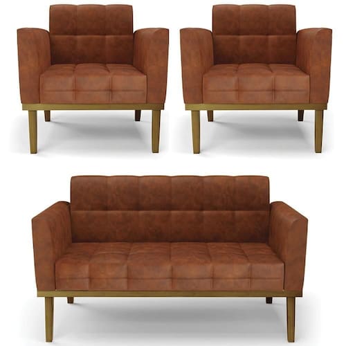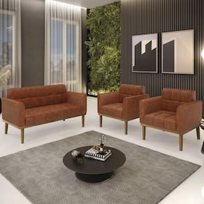 O Sofá Namoradeira e 2 Poltronas Base Madeira Castanho Ana Sintético PU Nozes, da Ibiza é o conjunto ideal para quem busca beleza, conforto e versatilidade. Você pode usar na sua Sala De Estar, recepção ou qualquer outro ambiente que desejar.