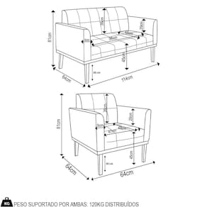 O Sofá Namoradeira e a Poltrona Decorativa são revestidos em sintético PU, que é fácil de limpar e valoriza o design das peças. Eles têm braços e encosto em espuma D-18 e assento em espuma D-26, que oferecem firmeza e aconchego para você relaxar. A base em madeira de eucalipto castanho é um detalhe charmoso, que dá um toque rústico e sofisticado ao conjunto. O kit tem uma estrutura resistente e suporta até 120 kg cada peça. A montagem é simples, pois as peças já vêm prontas, bastando fixar a base com os parafusos que acompanham o produto. A limpeza é prática, pois basta usar um pano limpo e levemente úmido, sem produtos abrasivos, para manter o seu kit sempre em bom estado. Hora de transformar seu ambiente com a Namoradeira 2 Lugares e a Poltrona para Sala deixando ainda mais confortável e estiloso.