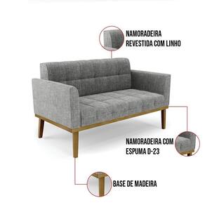 Você gosta de colecionar vários momentos memoráveis com sua família e amigos? Que tal recebê-los, com móveis de altíssima qualidade que só a D'Rossi tem? O Sofá Sofá Namoradeira e Poltrona Elisa é adequado para você! Seu design retrô é a grande tendência do momento. Pode ser utilizado em diversos espaços da casa, em salas, hall de entrada, quartos, cozinhas, varanda, sacada, escritório, dentre outros. Contém as seguintes características: A estrutura é feita de madeira de Eucalipto 100% de reflorestamento, e a Base de Madeira Fixa Castanho, além de ser resistente e durável, suporta em média até 120 kg. Assento, encosto e braços, contém enchimento de espuma D-23 e é estofada em tecido Linho, no tom Grafite, que oferece muito conforto e resistência ao sentar, com aquela sensação de maciez e aconchego. Possui também, detalhes de costura no encosto e assento, resultando em um acabamento impecável, conferindo muito mais valor e elegância ao seu espaço. Para complementar a decoração com esse lindo kit Sofá Sofá Namoradeira e Poltrona Elisa, a dica é utilizar mantas, almofadas ou vasinho de flor. E pronto, seu cantinho estará perfeito para descansar e relaxar! Aqui, você encontra várias opções, para que seus amigos e familiares se sintam acolhidos. Garanta já seu kit Sofá Sofá Namoradeira e 2 Poltronas Elisa.