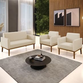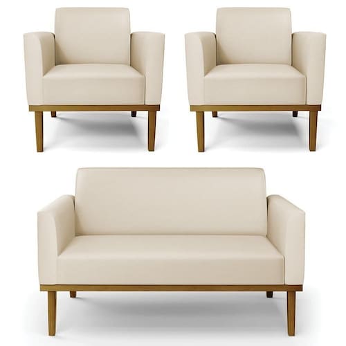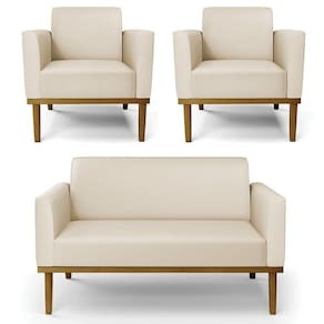 O Sofá Namoradeira e 2 Poltronas Base Madeira Castanho Maressa Sintético Bege, da Ibiza é o conjunto ideal para quem busca beleza, conforto e versatilidade. Você pode usar na sua Sala De Estar, recepção ou qualquer outro ambiente que desejar.