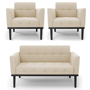 O Sofá Namoradeira e 2 Poltronas Base Madeira Preto Ana Suede Bege, da Ibiza é o conjunto ideal para quem busca beleza, conforto e versatilidade. Você pode usar na sua Sala De Estar, recepção ou qualquer outro ambiente que desejar.