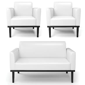 O Sofá Namoradeira e 2 Poltronas Base Madeira Preto Maressa Sintético PU Branco, da Ibiza é o conjunto ideal para quem busca beleza, conforto e versatilidade. Você pode usar na sua Sala De Estar, recepção ou qualquer outro ambiente que desejar.