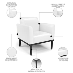 O Sofá Namoradeira e a Poltrona Decorativa são revestidos em sintético PU branco, que é fácil de limpar e valoriza o design das peças. Eles têm braços e encosto em espuma D-18 e assento em espuma D-26, que oferecem firmeza e aconchego para você relaxar. A base em madeira de eucalipto Preto é um detalhe charmoso, que dá um toque rústico e sofisticado ao conjunto. O kit tem uma estrutura resistente e suporta até 120 kg cada peça. A montagem é simples, pois as peças já vêm prontas, bastando fixar a base com os parafusos que acompanham o produto. A limpeza é prática, pois basta usar um pano limpo e levemente úmido, sem produtos abrasivos, para manter o seu kit sempre em bom estado. Hora de transformar seu ambiente com a Namoradeira 2 Lugares e a Poltrona para Sala deixando ainda mais confortável e estiloso.