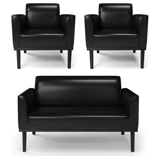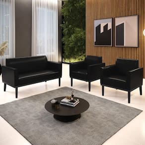 O Sofá Namoradeira e 2 Poltronas Base Madeira Preto Maressa Sintético PU Preto, da Ibiza é o conjunto ideal para quem busca beleza, conforto e versatilidade. Você pode usar na sua Sala De Estar, recepção ou qualquer outro ambiente que desejar.