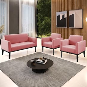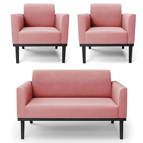 O Sofá Namoradeira e 2 Poltronas Base Madeira Preto Maressa Suede Rosê, da Ibiza é o conjunto ideal para quem busca beleza, conforto e versatilidade. Você pode usar na sua Sala De Estar, recepção ou qualquer outro ambiente que desejar.