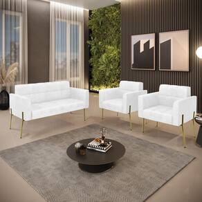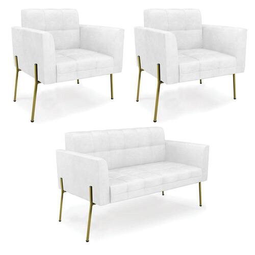 Sofá Namoradeira e 2 Poltronas Pé de Ferro Dourado Elisa Corano Branco D03 - D`Rossi