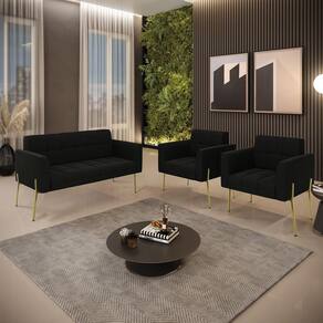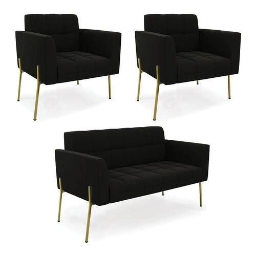 Você gosta de colecionar vários momentos memoráveis com sua família e amigos? Que tal recebê-los, com móveis de altíssima qualidade que só a D'Rossi tem? O Sofá Sofá Namoradeira e Poltrona Elisa é adequado para você! Seu design retrô é a grande tendência do momento. Pode ser utilizado em diversos espaços da casa, em salas, hall de entrada, quartos, cozinhas, varanda, sacada, escritório, dentre outros. Contém as seguintes características: A estrutura é feita Madeira de Eucalipto 100% de reflorestamento,Pés de Ferro Dourado que além de ser resistente e durável, suporta em média até 120 kg. Assento, encosto e braços, contém enchimento de espuma D-23 e é estofada em tecido Suede, no tom Preto, que oferece muito conforto e resistência ao sentar, com aquela sensação de maciez e aconchego. Possui também, detalhes de costura no encosto e assento, resultando em um acabamento impecável, conferindo muito mais valor e elegância ao seu espaço. Para complementar a decoração com esse lindo Kit Sofá Namoradeira e Poltrona Elisa, a dica é utilizar mantas, almofadas ou vasinho de flor. E pronto, seu cantinho estará perfeito para descansar e relaxar! Aqui, você encontra várias opções, para que seus amigos e familiares se sintam acolhidos. Garanta já seu Kit Sofá Namoradeira e 2 Poltronas Elisa.