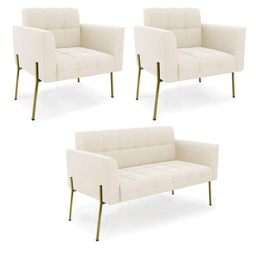 Estrutura: Madeira Eucalipto Espuma: D-23 Tecido: Corino Tipo de pés: Pé de Ferro Dourado Peso suportado: Até 120 Kg Garantia: 90 dias contra defeito de fabricação Montagem: O produto vai montado, apenas parafusar a base Instruções de limpeza: Utilizar um pano limpo e levemente úmido Você irá receber: 01 Sofá Namoradeira e 01 Poltrona - Entregue em: 02 Volumes