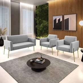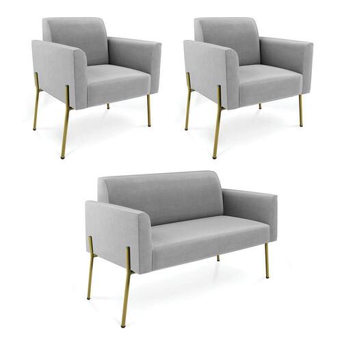 Sofá Namoradeira e 2 Poltronas Pé de Ferro Dourado Marisa Suede D03 - D`Rossi - Cinza