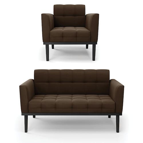 Estrutura: Madeira Eucalipto Espuma: D-23 Tecido: Veludo Tipo de pés: Base Madeira Fixa Preto Peso suportado: Até 120 Kg Garantia: 90 dias contra defeito de fabricação Montagem: O produto vai montado, apenas parafusar a base Instruções de limpeza: Utilizar um pano limpo e levemente úmido Você irá receber: 01 Sofá Namoradeira e 01 Poltrona - Entregue em: 02 Volumes