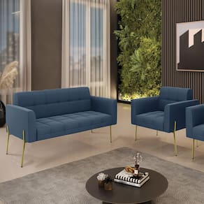 Estrutura: Madeira Eucalipto Espuma: D-23 Tecido: Corino Tipo de pés: Pé de Ferro Dourado Peso suportado: Até 120 Kg Garantia: 90 dias contra defeito de fabricação Montagem: O produto vai montado, apenas parafusar a base Instruções de limpeza: Utilizar um pano limpo e levemente úmido Você irá receber: 01 Sofá Namoradeira e 01 Poltrona - Entregue em: 02 Volumes