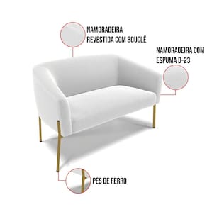 Tem novidades chegando por aqui! Olha só essa nossa inédita Namoradeira e Poltrona Stella Bouclê. Sim, as melhores opções em Namoradeira estão aqui! A Namoradeira e Poltrona Stella Bouclê é para todas as ocasiões, é ideal para você relaxar, assistir tv ou ler um livro, mantendo-o confortável ao longo do dia! Um estofado versátil, que foge do convencional pelo seu design e tecido luxuoso. Seu formato curvo, marcante e sofisticado, oferece conforto de forma excepcional, com aquela sensação de abraço, que deixa o coração quentinho! Desenvolvida com atenção aos detalhes, para atender todas suas expectativas e necessidades. Seu aspecto arredondado e anatômico, possibilita que a postura fique sempre alinhada, mantendo a coluna na posição correta. Ela dispõe de um acabamento impecável, revestida em Bouclê um tecido maleável que além de ser muito bonito, é a grande tendência do momento, por ser uma lã mais refinada, quente, com toque suave e agradável, semelhante à textura natural da ovelha. Contém uma estrutura robusta, sua sustentação é dada pelos Pés de Ferro no tom Dourado, que garantem mais segurança e firmeza ao sentar-se. Já o enchimento é feito em espuma D-23 no encosto e assento, garantindo maior conforto ao usuário. Ah! Vale a pena lembrar que a Namoradeira e Poltrona Stella Bouclê, foi produzida em quantidades limitadas, para aqueles que procuram criar um visual diferenciado e exclusivo. Então, não deixe de aproveitar esse lançamento, hem! Leve a sua agora mesmo.