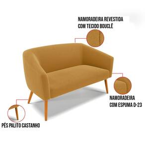 Tem novidades chegando por aqui! Olha só essa nossa inédita Namoradeira e Poltrona Stella Bouclê. Sim, as melhores opções em Namoradeira estão aqui! A Namoradeira e Poltrona Stella Bouclê é para todas as ocasiões, é ideal para você relaxar, assistir tv ou ler um livro, mantendo-o confortável ao longo do dia! Um estofado versátil, que foge do convencional pelo seu design e tecido luxuoso. Seu formato curvo, marcante e sofisticado, oferece conforto de forma excepcional, com aquela sensação de abraço, que deixa o coração quentinho! Desenvolvida com atenção aos detalhes, para atender todas suas expectativas e necessidades. Seu aspecto arredondado e anatômico, possibilita que a postura fique sempre alinhada, mantendo a coluna na posição correta. Ela dispõe de um acabamento impecável, revestida em Bouclê em tom Mostarda, um tecido maleável que além de ser muito bonito, é a grande tendência do momento, por ser uma lã mais refinada, quente, com toque suave e agradável, semelhante à textura natural da ovelha. Contém uma estrutura robusta, sua sustentação é dada pelos Pés Palito no tom Castanho, que garantem mais segurança e firmeza ao sentar-se. Já o enchimento é feito em espuma D-23 no encosto e assento, garantindo maior conforto ao usuário. Ah! Vale a pena lembrar que a Namoradeira e Poltrona Stella Bouclê, foi produzida em quantidades limitadas, para aqueles que procuram criar um visual diferenciado e exclusivo. Então, não deixe de aproveitar esse lançamento, hem! Leve a sua agora mesmo.