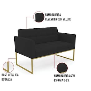 Você gosta de colecionar vários momentos memoráveis com sua família e amigos? Que tal recebê-los, com móveis de altíssima qualidade que só a DRossi tem? A Namoradeira 2 Lugares Elisa é adequada para você! Seu design retrô é a grande tendência do momento. Pode ser usada em diversos espaços da casa, em salas, hall de entrada, quartos, cozinhas, varanda, sacada, escritório, dentre outros. Contém as seguintes características: A estrutura é feita de madeira de Eucalipto 100% de reflorestamento, e a Base Metálica Industrial Dourado, além de ser resistente e durável, suporta em média até 120 kg. Assento, encosto e braços, contém enchimento de espuma D-23 e é estofada em tecido Veludo, no tom Preto, que oferece muito conforto e resistência ao sentar, com aquela sensação de maciez e aconchego. Possui também, detalhes de costura no encosto e assento, resultando em um acabamento impecável, conferindo muito mais valor e elegância ao seu espaço. Para complementar a decoração com essa linda namoradeira, a dica é utilizar mantas, almofadas ou vasinho de flor. E pronto, seu cantinho estará perfeito para descansar e relaxar! Aqui, você encontra várias opções, para que seus amigos e familiares se sintam acolhidos. Garanta já sua Namoradeira Elisa.