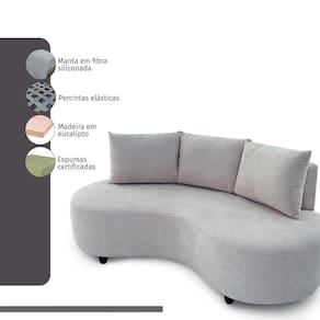 Assentos com espuma flexível de poliuretano densidade 29kg/m macia certificada, de fabricação própria, sustentados por percinta elástica. Almofada de Encosto em fibra siliconada. Estrutura de madeira maciça de eucalipto 100% reflorestada. Fixação da estrutura: grampos galvanizados anti-ferrugem. Apoiados no chão com pés em madeira de 8 cm. Revestimento/tecido: Boucle 100% poliéster, com toque macio.