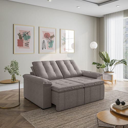 Sofá Palmeira Retrátil Reclinável sem caixa é a solução perfeita para quem tem pouco espaço disponível. Com ele você poderá acomodar suas visitas com conforto e praticidade em ambientes pequenos, a otimização do espaço é um ponto chave para garantir maior conforto e mobilidade. O sofá Palmeira possui braços de apenas 15cm de largura, proporcionando um maior aproveitamento da área disponível na sua sala de estar. Produzido em madeira maciça de eucalipto. Depois nos conte como foi a experiência de compra e como ficou seu ambiente nos comentários. Acompanha Almofadas extras: Não Almofada do assento: Fixa Almofada do encosto: Removível Altura do assento até o chão: 48 Altura do Encosto: 58 Altura dos Pés: 3 Ambiente Principal: Sala de Estar Complexidade da Montagem: Baixa: pode ser montado por uma pessoa sozinha Cor: Marrom Cor do Produto: Marrom Densidade do Assento: D-24 Densidade do Encosto: Camadas de Densidades Diferentes Enchimento do Assento: Espuma Enchimento do Encosto: Fibra Siliconada Estilo de Braço: Braços Pillow Top Firmeza do Assento: Médio Informações Complementares: Sofá sem caixa que otimiza o espaço Itens Inclusos: Sofá, 08 pés, Manual de Montagem Linha ou Coleção: Palmeira Manual de Montagem e Instalação: https://cdn2.madeiramadeira.com.br/atributo/takei-estofados/1548236-manual-sofapalmeira180-200-220.pdf Material dos Pés: PVC Necessita Montagem: Sim Origem do Produto: Nacional Peso: 69 Pet Friendly: Não Possui Entrada USB: Não Possui Percintas Elásticas: Sim Possui Pés: 08 Possui Rodízio: Sim Profundidade Quando Estendido: 134 Recomendações de Uso, Manutenção e Limpeza: Evitar exposição direta à luz solar, limpar com escova macia e aspirar o pó semanalmente, não utilizar produtos químicos, removedores, alvejantes, etc. Evite exercer pressão excessiva sobre determinada partes do estofado, não utilizar para limpeza equipamentos a vapor de água. Rodízio com Trava: Não Sistema de Montagem: Encaixe Suporta Até (kg): 300 Tecido Predominante: Linho Tipo de Encosto: Regulável Tipo de Mola: Molas Bonnel Ean: 7909903442609
