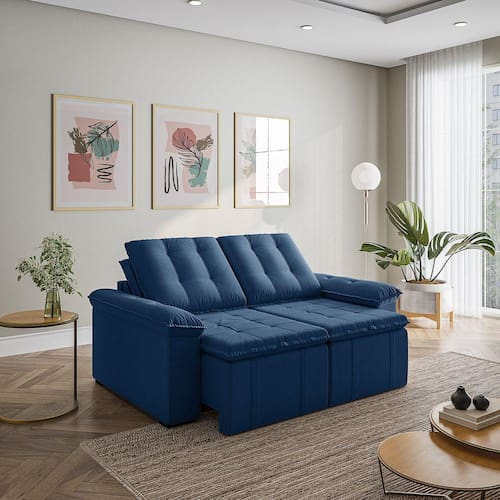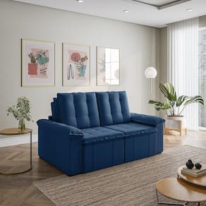 Sofá Palmeira Retrátil Reclinável sem caixa é a solução perfeita para quem tem pouco espaço disponível. Com ele você poderá acomodar suas visitas com conforto e praticidade em ambientes pequenos, a otimização do espaço é um ponto chave para garantir maior conforto e mobilidade. O sofá Palmeira possui braços de apenas 15cm de largura, proporcionando um maior aproveitamento da área disponível na sua sala de estar. Produzido em madeira maciça de eucalipto. Depois nos conte como foi a experiência de compra e como ficou seu ambiente nos comentários. Acompanha Almofadas extras: Não Almofada do assento: Fixa Almofada do encosto: Removível Altura do assento até o chão: 48 Altura do Encosto: 58 Altura dos Pés: 3 Ambiente Principal: Sala de Estar Complexidade da Montagem: Baixa: pode ser montado por uma pessoa sozinha Cor: Azul Cor do Produto: Azul Densidade do Assento: D-24 Densidade do Encosto: Camadas de Densidades Diferentes Enchimento do Assento: Espuma Enchimento do Encosto: Fibra Siliconada Estilo de Braço: Braços Pillow Top Firmeza do Assento: Médio Informações Complementares: Sofá sem caixa que otimiza o espaço Itens Inclusos: Sofa, 08 pés, Manual de Montagem Linha ou Coleção: Palmeira Manual de Montagem e Instalação: https://cdn2.madeiramadeira.com.br/atributo/takei-estofados/1544732-manual-sofapalmeira180-200-220.pdf Material dos Pés: PVC Necessita Montagem: Sim Origem do Produto: Nacional Peso: 69 Pet Friendly: Não Possui Entrada USB: Não Possui Percintas Elásticas: Sim Possui Pés: 08 Possui Rodízio: Sim Profundidade Quando Estendido: 134 Recomendações de Uso, Manutenção e Limpeza: Evitar exposição direta à luz solar, limpar com escova macia e aspirar o pó semanalmente, não utilizar produtos químicos, removedores, alvejantes, etc. Evite exercer pressão excessiva sobre determinada partes do estofado, não utilizar para limpeza equipamentos a vapor de água. Rodízio com Trava: Não Sistema de Montagem: Encaixe Suporta Até (kg): 300 Tecido Predominante: Veludo Tipo de Encosto: Regulável Tipo de Mola: Molas Bonnel Ean: 7909903442524