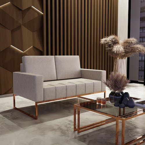 Conforto, Beleza e Sofisticação você encontra no Sofá Atena, a sua recepção ou seu escritório para estarem completos merecem esse Sofá. Tem como principal característica o conforto e seu estilo moderno. Excelente estrutura composta por madeira de reflorestamento, base de metal na cor cobre, tecido sintético de alta qualidade, resistente, durável e possui uma aparência similar ao couro marroml o que torna esse produto mais do que especial. Acompanha Almofadas extras: Não Almofada do assento: Fixa Almofada do encosto: Removível Altura do assento até o chão: 45 Altura do Encosto: 49 Altura dos Pés: 15 Ambiente Principal: Escritório Complexidade da Montagem: Baixa: pode ser montado por uma pessoa sozinha Cor: Bege Cor do Produto: Bege Densidade do Assento: D-23 Densidade do Encosto: D-23 Enchimento do Assento: Espuma Enchimento do Encosto: Fibra Siliconada Estilo de Braço: Braços Quadrados Firmeza do Assento: Médio Informações Complementares: Sofá fixo com Almofadas soltas, estrutura em madeira de eucalipto e pinnus, composto com percinta elástica, manta siliconada e espuma d23. Revestido com tecido Sintético Bege. Pés de metal na cor Cobre. Itens Inclusos: 1 Sofá Linha ou Coleção: Atena Manual de Montagem e Instalação: https://product-hub-prd.madeiramadeira.com.br/874992/documents/22a4481d-3734-449e-8fd6-9b8ed4d264fb1614026manualatena.pdf Material dos Pés: Ferro Necessita Montagem: Sim Nível de Conforto: Intermediário Origem do Produto: Nacional Peso: 306 Pet Friendly: Não Possui Percintas Elásticas: Sim Possui Pés: 02 Possui Rodízio: Não Recomendações de Uso, Manutenção e Limpeza: Seguir o manual de instruções Resistente à Chuva: Não Revestimento do Braço: Sintético Rodízio com Trava: Não Sistema de Montagem: Sim Suporta Até (kg): 120 Tecido Predominante: Couro Tipo de Encosto: Fixo Tipo de Mola: Não Possui Ean: 7909903460436