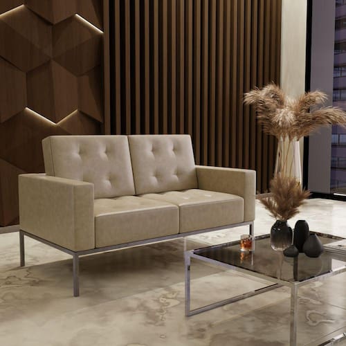 Conforto, Beleza e Sofisticação você encontra no Sofá Isis, a sua recepção ou seu escritório para estarem completos merecem esse Sofá. Tem como principal característica o conforto e seu estilo moderno. Excelente estrutura composta por madeira de reflorestamento, base de metal na cromada, tecido sintético de alta qualidade, resistente, durável e possui uma aparência similar ao couro marroml o que torna esse produto mais do que especial. Acompanha Almofadas extras: Não Almofada do assento: Fixa Almofada do encosto: Fixa Altura do assento até o chão: 45 Altura do Encosto: 49 Altura dos Pés: 15 Ambiente Principal: Escritório Complexidade da Montagem: Baixa: pode ser montado por uma pessoa sozinha Cor: Bege Cor do Produto: Bege Densidade do Assento: D-23 Densidade do Encosto: D-23 Enchimento do Assento: Espuma Enchimento do Encosto: Fibra Siliconada Estilo de Braço: Braços Quadrados Firmeza do Assento: Médio Informações Complementares: Sofá fixo, estrutura em madeira de eucalipto e pinnus, composto com percinta elástica, manta siliconada e espuma d23. Revestido com tecido Sintético Bege. Pés de metal cromados. Itens Inclusos: 1 Sofá Linha ou Coleção: Linha Material dos Pés: Ferro Necessita Montagem: Sim Nível de Conforto: Intermediário Origem do Produto: Nacional Peso: 30.6 Pet Friendly: Não Possui Percintas Elásticas: Sim Possui Pés: 02 Possui Rodízio: Não Recomendações de Uso, Manutenção e Limpeza: Seguir o manual de instruções Resistente à Chuva: Não Revestimento do Braço: Sintético Rodízio com Trava: Não Sistema de Montagem: Sim Suporta Até (kg): 120 Tecido Predominante: Couro Tipo de Encosto: Fixo Tipo de Mola: Não Possui Ean: 7909903458976