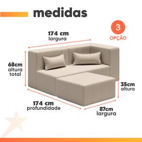 MEDIDAS DO PUFF COM ENCOSTO (cada): [ A ] = 68 cm [ L ] = 87 cm [ P ] = 87 cm MEDIDAS PUFF: [ A ] = 35 cm [ L ] = 87 cm [ P ] = 87 cm ALTURA DO ENCOSTO: 33 cm PESO: 35,55 Kg PESO SUPORTADO: 150 Kg Por Pessoa MODELO: Sofá Puff Modular Com Chaise Bilateral Boucle MARCA: CBP TECIDO: Boucle MATERIAL DA ESTRUTURA: Produzido com 100% Espuma Copolimérica de Alta Densidade, garante firmeza, durabilidade e um conforto superior, mantendo o formato e o suporte ideal mesmo com o uso contínuo. DENSIDADE DE ESPUMA: Camada de espuma D28 dentro dos padrões ABNT, de alta qualidade, suportando até 150kg por pessoa. QUANTIDADE DE LUGARES: 2 a 3 TIPO DE SOFÁ: Sofá de Canto DIFERENCIAL: Vem embalado em uma caixa compacta e prática, expandindo-se completamente em até 48 horas. Você pode montar do seu jeito e reconfigurar sempre que quiser, adaptando-se perfeitamente ao seu espaço e estilo de vida. SISTEMA DE MONTAGEM: Smart Pack VALE A PENA SABER: A tonalidade de cor pode variar de acordo com o lote do fabricante. GARANTIA: 3 Meses