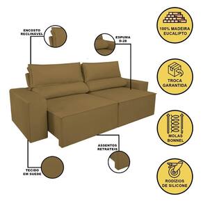 Espuma D28 para maior conforto e resistência Assentos com molas para um suporte extra Manta siliconada que garante maciez e aconchego Tecido Suede de alta gramatura, proporcionando sofisticação e durabilidade Rodinhas cristal para facilitar a movimentação Sistema reclinável em aço com 4 regulagens de inclinação Enchimento da almofada de encosto com fibra siliconada e mix de espuma Estrutura 100% em eucalipto, garantindo alta resistência e sustentabilidade Percintas elásticas que oferecem um suporte adicional