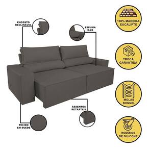 Espuma D28 para maior conforto e resistência Assentos com molas para um suporte extra Manta siliconada que garante maciez e aconchego Tecido Suede de alta gramatura, proporcionando sofisticação e durabilidade Rodinhas cristal para facilitar a movimentação Sistema reclinável em aço com 4 regulagens de inclinação Enchimento da almofada de encosto com fibra siliconada e mix de espuma Estrutura 100% em eucalipto, garantindo alta resistência e sustentabilidade Percintas elásticas que oferecem um suporte adicional