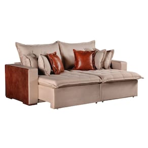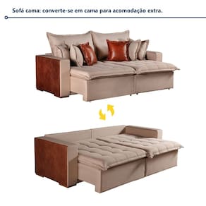 É um sofá cama confortável quando abre? Muito. É confortável e espaçoso. Produto Montado: Não Almofada do assento: Fixa Almofada do encosto: Removível Altura do assento até o chão: 50.0000 Altura do Encosto: 70 cm Altura dos Pés: 2,5 cm Altura Máxima dos Pés: 2.5000 Ambiente Principal: Sala de Estar codigo_ean: 7900288123985 Cor: Bege/Marrom Cor do Produto: Bege/Marrom Densidade do Assento: D-26 Enchimento do Assento: Espuma Estilo de Braço: Braços Quadrados Firmeza do Assento: Macio Itens Inclusos: 01 Sofá, 6 Almofadas Largura do Braço: 20 cm Marca: Kasacomigo Estofados Material dos Pés: Eucalipto Necessita Montagem: Não Origem do Produto: Nacional Peso: 73,8 kg Pet Friendly: Não Possui Baú: Não Possui Mola: Sim Possui Percintas Elásticas: Sim Possui Pés: 08 Possui Rodízio: Sim Quantidade de Molas por Assento: 2 Recomendações de Uso, Manutenção e Limpeza: Pano úmido Rodízio com Trava: Não Suporta Até (kg): 300 kg Tecido Predominante: Linho Tipo de Encosto: Regulável Tipo de Sofá: Sofá Cama Marca: Kasacomigo Estofados