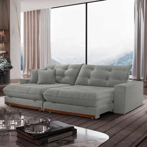 O sofá Belize possui um design moderno, sofisticado e acolhedor que são um convite a desfrutar momentos de alegria e lazer com seus amigos e familiares. Seu assento retrátil e extensível com abetura de 170 cm, pillow de 30 cm, molas ensacadas, espuma D28 e percintas elásticas de excelente qualidade garantem conforto e resistência ao sofá. O encosto são preenchidos com fibra 100% silicone e possuem 7 estágios de recline. A estrutura é fabricada em eucalipto reflorestado, seco e imunizado e os pés em madeira maciça com acabamento em verniz fosco. Além disso, possui possui detalhe na base do aasento em madeira maciça e 02 almofadas decorativas preenchidas com fibra 100% silicone. O sofá Belize é garantia de conforto para sua sala de estar! Produto Montado: Sim Acompanha Almofadas extras: 02 Almofada do assento: Fixa Almofada do encosto: Fixa Altura do assento até o chão: 48.0000 Altura do Encosto: 67 cm Altura dos Pés: 5 cm Ambiente Principal: Sala de Estar Bipartida: Sim codigo_ean: 7900288147639 Complexidade da Montagem: Média: pode ser montado por mais de uma pessoa e/ou necessite de maior conhecimento para montagem Cor: Cinza Cor do Produto: Cinza Enchimento do Assento: Hyper Soft Enchimento do Encosto: Fibra Siliconada Estilo de Braço: Braços Largos Firmeza do Assento: Médio Gramatura do Tecido: 375 g/m² Itens Inclusos: 1 Sofá, 2 Almofadas e Manual de Montagem Largura do Braço: 25 cm Linha ou Coleção: Mundo Manual de Especificação Técnica: https://product-hub-prd.madeiramadeira.com.br/779010503/documents/3b66dcf2-4578-4e76-a797-4fac37cc703d2925278204117471658139887.pdf Manual de Montagem e Instalação: https://product-hub-prd.madeiramadeira.com.br/779010503/documents/5dc89aaa-d01b-4aa5-8e46-2af82bd609a82925277204117471658102669.pdf Marca: Le estofados Material da Corrediça do Sofá: Aço/Metal Material dos Pés: Madeira Montagem Flex: Não Necessita Montagem: Sim Nível de Conforto: Firme Origem do Produto: Nacional Peso: 76 kg Peso Suportado por m²: 130 kg/m² Pet Friendly: Não Porta Copos: Não Possui Baú: Não Possui Entrada USB: Não Possui Mola: Sim Possui Percintas Elásticas: Sim Possui Pés: 06 Possui Rodízio: Sim Profundidade Quando Estendido: 170 cm Profundidade quando extendido: 170.0000 Quantidade de Estágios do Encosto: 7 Quantidade de Itens: 1 Quantidade de Molas por Assento: 9 Recomendações de Uso, Manutenção e Limpeza: Utilizar pano úmido Revestimento do Braço: Linho Rodízio com Trava: Não Sistema de Montagem: Encaixe Suporta Até (kg): 130 kg Tecido Predominante: Linho Tipo de Encosto: Regulável Tipo de Mola: Molas Ensacadas Tipo de Sofá: Sofá Comum
