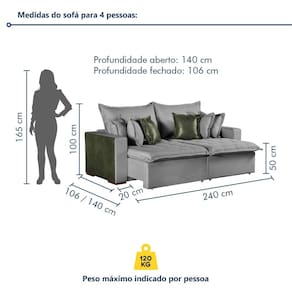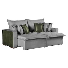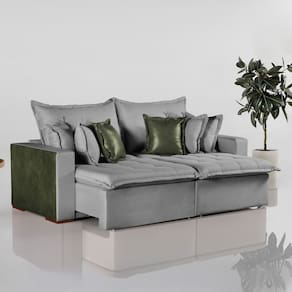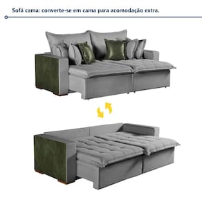É um sofá cama confortável quando abre? Muito. É confortável e espaçoso. Produto Montado: Não Almofada do assento: Fixa Almofada do encosto: Removível Altura do assento até o chão: 50.0000 Altura do Encosto: 70 cm Altura dos Pés: 2,5 cm Altura Máxima dos Pés: 2.5000 Ambiente Principal: Sala de Estar codigo_ean: 7900288123992 Cor: Cinza/Verde Cor do Produto: Cinza/Verde Densidade do Assento: D-26 Enchimento do Assento: Espuma Estilo de Braço: Braços Quadrados Firmeza do Assento: Macio Itens Inclusos: 01 Sofá, 6 Almofadas Largura do Braço: 20 cm Marca: Kasacomigo Estofados Material dos Pés: Eucalipto Necessita Montagem: Não Origem do Produto: Nacional Peso: 79,8 kg Pet Friendly: Não Possui Baú: Não Possui Mola: Sim Possui Percintas Elásticas: Sim Possui Pés: 08 Possui Rodízio: Sim Quantidade de Molas por Assento: 2 Recomendações de Uso, Manutenção e Limpeza: Pano úmido Rodízio com Trava: Não Suporta Até (kg): 300 kg Tecido Predominante: Linho Tipo de Encosto: Regulável Tipo de Sofá: Sofá Cama Marca: Kasacomigo Estofados