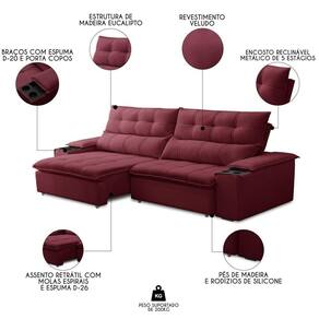 Um móvel que combina conforto, beleza e praticidade! Conheça o Sofá Retrátil 3 Lugares com Porta Copo 230cm Malta F05 Veludo Vinho, da Mpozenato.
