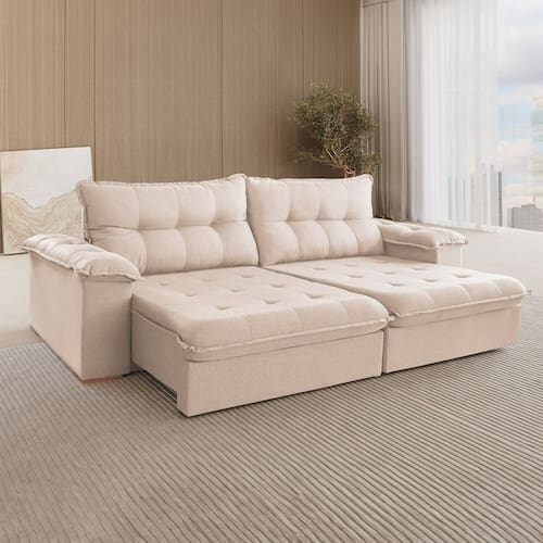 Este sofá retrátil estofado em linho oferece o máximo em conforto e praticidade, com braços almofadados que adicionam um toque extra de aconchego. Seu encosto com reclinação de 90 graus permite ajustar a posição para relaxamento ideal. O design moderno e funcional faz dele a escolha perfeita para quem busca um mobiliário versátil e elegante. Ideal para otimizar o espaço sem sacrificar o estilo. Produto Montado: Sim Acompanha Almofadas extras: Não Almofada do assento: Fixa Almofada do encosto: Removível Altura do assento até o chão: 47.0000 Altura do Encosto: 58 cm Altura dos Pés: 12 cm Ambiente Principal: Sala de Estar codigo_ean: 7900288205438 Complexidade da Montagem: Baixa: pode ser montado por uma pessoa sozinha Cor: Bege Cor do Produto: Bege Itens Inclusos: 1 Sofá e Kit Ferragens Linha ou Coleção: Muriaé Marca: Lufer Estofados Material dos Pés: Madeira Maciça Necessita Montagem: Sim Origem do Produto: Nacional Peso: 85 kg Pet Friendly: Não Possui Percintas Elásticas: Sim Possui Pés: 08 Possui Rodízio: Sim Profundidade Quando Estendido: 180 cm Profundidade quando extendido: 180.0000 Recomendações de Uso, Manutenção e Limpeza: Limpar com pano umedecido, sem produtos Rodízio com Trava: Não Sistema de Montagem: Parafuso, encaixe Suporta Até (kg): 240 kg Tecido Predominante: Linho Tipo de Encosto: Regulável Tipo de Sofá: Sofá Cama