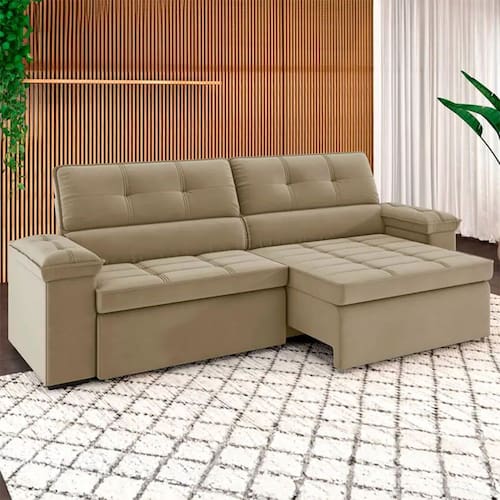 Conforto O sofá oferece amplo espaço para toda a família. A função retrátil permite que os assentos se estendam, isso aumenta ainda mais o conforto para quem deseja descansar com as pernas esticadas. Já o sistema reclinável permite que o encosto seja ajustado, o que oferece o apoio ideal para um momento de descanso ou até mesmo para assistir a filmes e séries com muito mais comodidade.