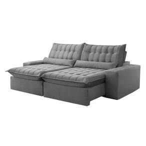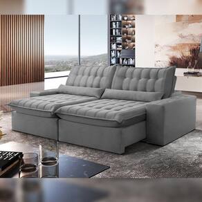 O revestimento em tecido com manta acrílica recebe costura com pesponto duplo, feito com máquinas de ponto eletrônico, proporciona beleza nos desenhos captonê e resistência da costura Acompanha Almofadas extras: Não Almofada do assento: Fixa Almofada do encosto: Fixa Altura do assento até o chão: 57 Altura do Encosto: 57 Altura dos Pés: 2.5 Ambiente Principal: Sala de Estar Complexidade da Montagem: Baixa: pode ser montado por uma pessoa sozinha Cor: Veludo/Grafite Cor do Produto: Veludo/Grafite Densidade do Assento: D-28 Densidade do Encosto: D-18 Enchimento do Assento: Hyper Soft Enchimento do Encosto: Fibra Siliconada Estilo de Braço: Braços Quadrados Firmeza do Assento: Macio Itens Inclusos: 1 Sofá, 1 Kit Ferragens, 1 Manual de Montagem Material dos Pés: Madeira Necessita Montagem: Sim Origem do Produto: Nacional Peso: 102.56 Pet Friendly: Não Possui Percintas Elásticas: Sim Possui Pés: 08 Possui Rodízio: Sim Profundidade Quando Estendido: 180 Recomendações de Uso, Manutenção e Limpeza: A limpeza do revestimento deve ser feita com escova ou tecido de algodão branco levemente umedecidos em água morna, sabão neutro ou produto específico. Não usar produtos corrosivos nem a base de solventes, como: cloro, alvejantes, detergentes, entre outros;Não expor o estofado à luz direta. Mantenha portas e janelas sempre protegidas com cortinas e blackout. A exposição contínua à radiação da luz, danifica o revestimento, apodrecendo os fios, trincando a superfície e desbotando as cores;Não lavar o revestimento das almofadas pois pode desfiá-las, abrindo as costuras;Não utilizar o estofado para fins diferentes do que foi projetado: ficar em pé, pular, arrastar, sentar nos braços, peso na caixa traseira, entre outros tipos de ações que poderão danificar o produto. Resistente à Chuva: Não Revestimento do Braço: Veludo Rodízio com Trava: Não Sistema de Montagem: Encaixe Suporta Até (kg): 120 Tecido Predominante: Veludo Tipo de Encosto: Regulável Tipo de Mola: Molas Espirais Ean: 7909903380796