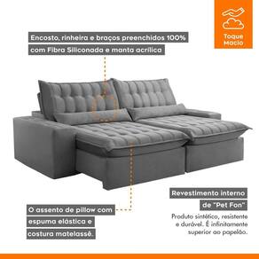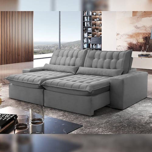 O assento de pillow com esuma elática e costura matelado. Possui mecanismo retrátil em aço que permite abertura do sofá para seu bem-estar.