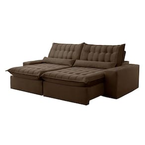 O revestimento em tecido com manta acrílica recebe costura com pesponto duplo, feito com máquinas de ponto eletrônico, proporciona beleza nos desenhos captonê e resistência da costura Acompanha Almofadas extras: Não Almofada do assento: Fixa Almofada do encosto: Fixa Altura do assento até o chão: 57 Altura do Encosto: 57 Altura dos Pés: 2.5 Ambiente Principal: Sala de Estar Complexidade da Montagem: Baixa: pode ser montado por uma pessoa sozinha Cor: Veludo/Marrom Cor do Produto: Veludo/Marrom Densidade do Assento: D-28 Densidade do Encosto: D-18 Enchimento do Assento: Hyper Soft Enchimento do Encosto: Fibra Siliconada Estilo de Braço: Braços Quadrados Firmeza do Assento: Macio Itens Inclusos: 1 Sofá, 1 Kit Ferragens, 1 Manual de Montagem Material dos Pés: Madeira Necessita Montagem: Sim Origem do Produto: Nacional Peso: 109.24 Pet Friendly: Não Possui Percintas Elásticas: Sim Possui Pés: 08 Possui Rodízio: Sim Profundidade Quando Estendido: 180 Recomendações de Uso, Manutenção e Limpeza: A limpeza do revestimento deve ser feita com escova ou tecido de algodão branco levemente umedecidos em água morna, sabão neutro ou produto específico. Não usar produtos corrosivos nem a base de solventes, como: cloro, alvejantes, detergentes, entre outros;Não expor o estofado à luz direta. Mantenha portas e janelas sempre protegidas com cortinas e blackout. A exposição contínua à radiação da luz, danifica o revestimento, apodrecendo os fios, trincando a superfície e desbotando as cores;Não lavar o revestimento das almofadas pois pode desfiá-las, abrindo as costuras;Não utilizar o estofado para fins diferentes do que foi projetado: ficar em pé, pular, arrastar, sentar nos braços, peso na caixa traseira, entre outros tipos de ações que poderão danificar o produto. Resistente à Chuva: Não Revestimento do Braço: Veludo Rodízio com Trava: Não Sistema de Montagem: Sim Suporta Até (kg): 120 Tecido Predominante: Veludo Tipo de Encosto: Regulável Tipo de Mola: Molas Espirais Ean: 7909903380703