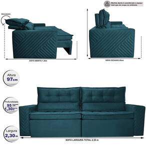 Tipo do Sofa: Retrátil e Reclinável | É sofá de canto: Não | É sofá-cama: Não | Encosto Reclinavel: Sim | Assento Retratil: Sim | Cor: Petróleo | Tonalidade: Petróleo | Cor Pincipal: Petróleo | Cor Via: Petróleo | Desenho do tecido: Liso | Acessórios incluídos: Não possui | Fabricante: Cama inBox | Quantidade de Lugares: 4 ou mais | Peso do Produto: 80,00 | Altura: 97,00 | Largura: 230,00 | Profundidade: 95,00 | Material do estofado: Madeira Reflorestada, Espuma, Tecido | Estilo: Moderno | Complexidade de Montagem: Média: pode ser montada por mais de uma pessoa leiga | Tempo Estimado de Montagem: 30 | Produto: Sofá | Comodo indicado: Salas | Custo da Manutenção: Baixo | Conservação e Manutenção do Produto: Para maior durabilidade, recomendamos que a limpeza dos estofados com revestimento em tecido, seja feito com aspirador de pó em baixa rotação ou escova com cerdas macias para a eliminação de poeira e pano úmido em água. Não utilizar agentes químicos! | Condição do item: | É kit: Não | Complexidade de Montagem Via: Fácil de Montar | Quantidade de Lugares Via: 4 ou mais lugares | Material para Filtro: Espuma | Estado de Origem: PR | Nome do Simples no Fornecedor: Cama inBox | Altura do Produto com Embalagem: 97 | Peso Produto Com Embalagem: 80 | Largura Produto Com Embalagem: 230 | Comprimento Produto Com Embalagem: 95 | Descrição do Tamanho: 230x97x95 | Montagem Necessária: Não | Conteúdo do produto: 1 sofá | Instruções do produto: Para maior durabilidade, recomendamos que a limpeza dos estofados com revestimento em tecido, seja feito com aspirador de pó em baixa rotação ou escova com cerdas macias para a eliminação de poeira e pano úmido em água. Não utilizar agentes químicos!