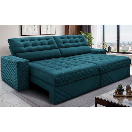 Sofá Retrátil e Reclinável 2,30m Molas Ensacadas Max Spring. Velusoft Cama inBox - Azul Petróleo