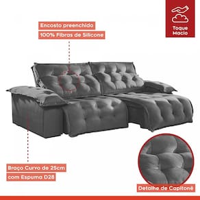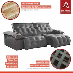 A sua sala de estar só está completa na presença de um bom sofá e nada mais gostoso do que receber a família ou curtir os seus momentos de descanso junto.! Pensado para quem quer aliar bom gosto mais uma estrutura reforçada para o uso diário, a peça tem madeira de eucalipto na composição e revestimento de toque agradável com o corpo para garantir que a receptividade seja plena. Já o visual elegante de coloração tradicional a esse tipo de móvel fecha com chave de ouro os benefícios que ele oferece para o seu doce lar ;) Acompanha Almofadas extras: Não Almofada do assento: Fixa Almofada do encosto: Fixa Altura do assento até o chão: 46 Altura do Encosto: 33 Altura dos Pés: 2 Ambiente Principal: Sala de Estar Complexidade da Montagem: Baixa: pode ser montado por uma pessoa sozinha Cor: Veludo/Cinza Escuro Cor do Produto: Veludo/Cinza Escuro Densidade do Assento: D-28 Densidade do Encosto: D-18 Enchimento do Assento: Espuma Enchimento do Encosto: Fibra Siliconada Estilo de Braço: Braços Largos Firmeza do Assento: Firme Informações Complementares: Itens Inclusos: 1 Sofá e Manual de Montagem Largura do Sofá Maior: Linha ou Coleção: Manual de Especificação Técnica: Manual de Montagem e Instalação: https://cdn2.madeiramadeira.com.br/atributo/martins-estofados/896879-manual-de-montagem-martins.pdf Material dos Pés: Madeira Montagem Flex: Necessita Montagem: Sim Origem do Produto: Nacional Peso: 110 Pet Friendly: Não Possui Percintas Elásticas: Sim Possui Pés: 08 Possui Rodízio: Sim Profundidade Quando Estendido: 180 Recomendações de Uso, Manutenção e Limpeza: Limpar com pano macio e levemente umedecido. Não utilizar solventes a base e de inflamáveis. Não utilizar produtos abrasivos. Resistente à Chuva: Revestimento do Braço: Veludo Rodízio com Trava: Não Sistema de Montagem: Encaixe Suporta Até (kg): 120 Tamanho: Tecido Predominante: Veludo Tipo de Encosto: Regulável Tipo de Madeira Maciça da Estrutura: Eucalipto Tipo de Mola: Molas Bonnel