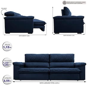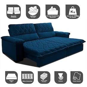 Sofá Retrátil e Reclinável 2,55m Molas Ensacadas Cama inBox Big Home. com Bordado 3D Velusoft - Azul Marinho