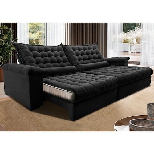 Sofá Retrátil E Reclinável 2,55m Molas Ensacadas Cama Inbox Big Space Com Bordado 3d Velusoft Preto