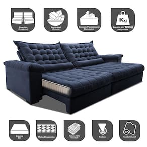 Sofá Retrátil e Reclinável 2,55m Molas Ensacadas Cama inBox Big Space. com Bordado 3D Velusoft - Azul Marinho