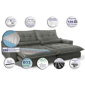 Características: -Encosto Reclinável com 5 posições, almofadas fixas compostas de 80% fibra siliconada e 20% flocos de espuma e percintas elasticas para maior conforto. -Assentos: Retráteis com espuma D33 soft envolvidas em fibra SILICONADA compactada, Molas ensacadas, percintas Pneumáticas com feltro para proteger do atrito com as molas. -Braços: Com 25cm de largura e com espuma D23. -Fixação: Grampos galvanizados -Estrutura de Madeira maciça 100% eucalipto de reflorestamento, produto ecologicamente correto -Tecido suede com toque aveludado -Pés em PVC