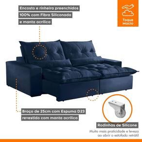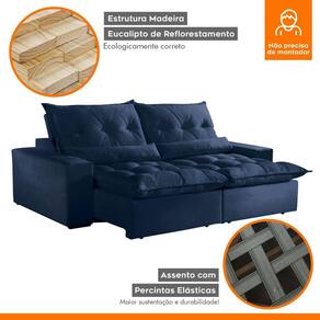 O braço é composto por espuma D23 revestido com manta acrílica Produto Montado: Sim Acompanha Almofadas extras: 02 Almofada do assento: Fixa Almofada do encosto: Fixa Altura do assento até o chão: 51.0000 Ambiente Principal: Sala de Estar codigo_ean: 7909903156957 Complexidade da Montagem: Média: pode ser montado por mais de uma pessoa e/ou necessite de maior conhecimento para montagem Cor: Veludo Marinho Cor do Produto: Veludo Marinho Enchimento do Assento: Fibra Siliconada Enchimento do Encosto: Fibra Siliconada Estilo de Braço: Braços Quadrados Material dos Pés: Madeira Necessita Montagem: Sim Origem do Produto: Nacional Pet Friendly: Não Possui Percintas Elásticas: Sim Possui Rodízio: Sim Profundidade Quando Estendido: 180 Recomendações de Uso, Manutenção e Limpeza: A limpeza do revestimento deve ser feita com escova ou tecido de algodão branco levemente umedecidos em água morna, sabão neutro ou produto específico. Não usar produtos corrosivos nem a base de solventes, como: cloro, alvejantes, detergentes, entre outros;Não expor o estofado à luz direta. Mantenha portas e janelas sempre protegidas com cortinas e blackout. A exposição contínua à radiação da luz, danifica o revestimento, apodrecendo os fios, trincando a superfície e desbotando as cores;Não lavar o revestimento das almofadas pois pode desfiá-las, abrindo as costuras;Não utilizar o estofado para fins diferentes do que foi projetado: ficar em pé, pular, arrastar, sentar nos braços, peso na caixa traseira, entre outros tipos de ações que poderão danificar o produto. Revestimento do Braço: Veludo Sistema de Montagem: Parafusos e Encaixe Tecido Predominante: Poliéster