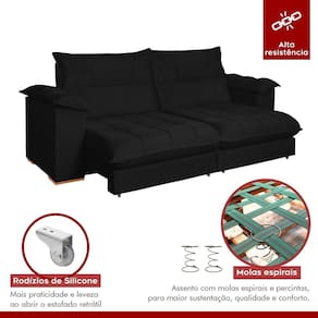 O Sofá Retrátil e Reclinável Italia da Kasacomigo Estofados é perfeito para quem valoriza conforto e elegância. Com um design moderno, ele se adapta a qualquer ambiente. O sistema retrátil e reclinável permite ajustar o assento para um relaxamento personalizado. Feito com estofado de alta qualidade, garante durabilidade e um toque macio. Ideal para transformar sua sala em um espaço acolhedor e sofisticado, proporcionando momentos de descanso superiores. Produto Montado: Sim Acompanha Almofadas extras: Não Almofada do assento: Fixa Almofada do encosto: Fixa Altura do assento até o chão: 50.0000 Altura do Encosto: 93 cm Altura dos Pés: 2,5 cm Ambiente Principal: Sala de Estar codigo_ean: 7909903718032 Complexidade da Montagem: Baixa: pode ser montado por uma pessoa sozinha Cor: Preto Cor do Produto: Preto Densidade do Assento: D-26 Enchimento do Assento: Espuma Enchimento do Encosto: Fibra Siliconada Firmeza do Assento: Firme Itens Inclusos: 1 Sofá e manual de instrução Linha ou Coleção: Italia Material dos Pés: Eucalipto Necessita Montagem: Sim Peso: 74 kg Pet Friendly: Não Possui Percintas Elásticas: Sim Possui Pés: 08 Possui Rodízio: Sim Recomendações de Uso, Manutenção e Limpeza: Limpeza com pano macio e levemente umedecido. Não utilizar solventes a base e de inflamáveis. Não utilizar produtos abrasivos. Revestimento do Braço: Veludo Rodízio com Trava: Não Sistema de Montagem: Encaixe. Suporta Até (kg): 120 kg Tecido Predominante: Veludo Tipo de Encosto: Regulável Marca: Kasacomigo Estofados