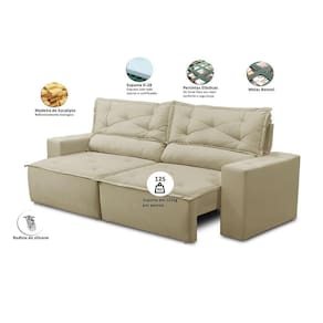 Assento: Feito com espuma D-28 com percintas elásticas de 5mm e Molas, o assento é retrátil que permite você utilizar o sofá com as pernas esticadas e ter todo o conforto que ele possa te proporcionar.