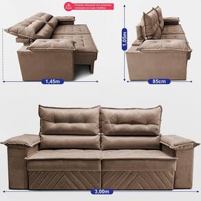Sofá Retrátil e Reclinável 3,00m com Molas e Espuma D33 Thunder. Velusoft Cama inBox - Palha