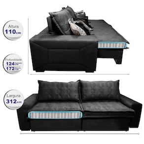 Sofá Retrátil e Reclinável 3,12m com Molas Ensacadas Cama Inbox Supreme Tecido Suede Velusoft Preto