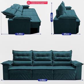 Informação Importante: As medidas exibidas no cadastro contemplam o sofá totalmente montado, com o assento retrátil estendido (aberto), o encosto reclinado nas posições máximas, bem como a largura total entre as extremidades das almofadas de braço. Dessa forma, você visualiza o espaço necessário tanto na posição fechada quanto aberta/reclinada.